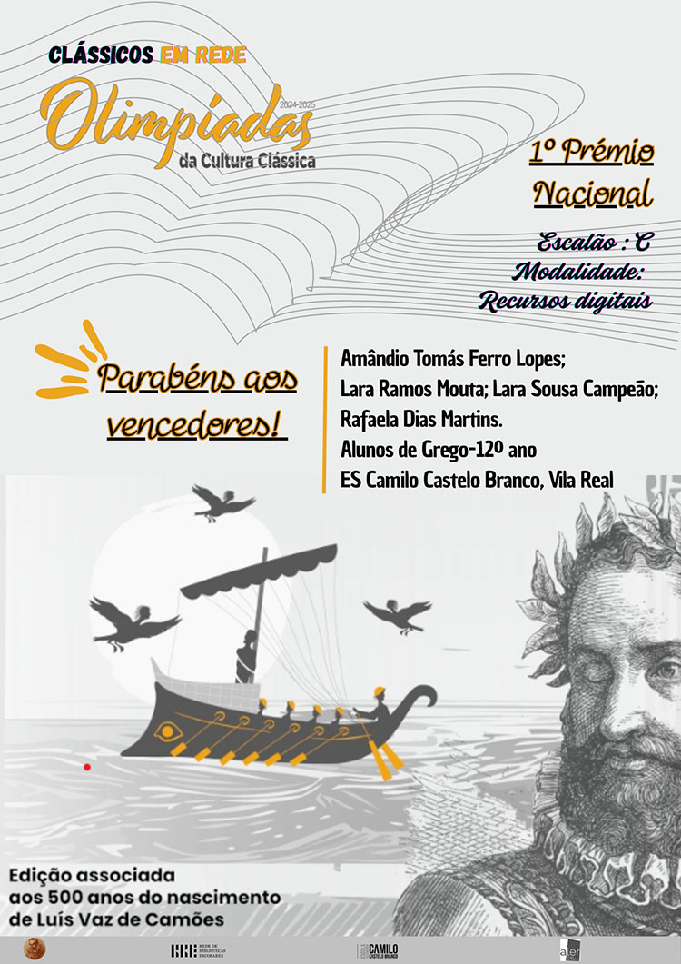 Amândio Tomás Ferro Lopes, Lara Ramos Mouta, Lara Sousa Campeão e Rafaela Dias Martins, alunos do 12.º ano da disciplina de Grego da Escola Secundária Camilo Castelo Branco, sagraram-se vencedores do concurso nacional “Clássicos em Rede – Olimpíadas da Cultura Clássica”, no escalão C (10.º, 11.º e 12.º anos), na modalidade de Recursos Digitais.