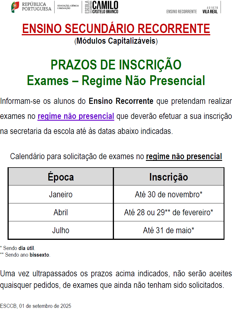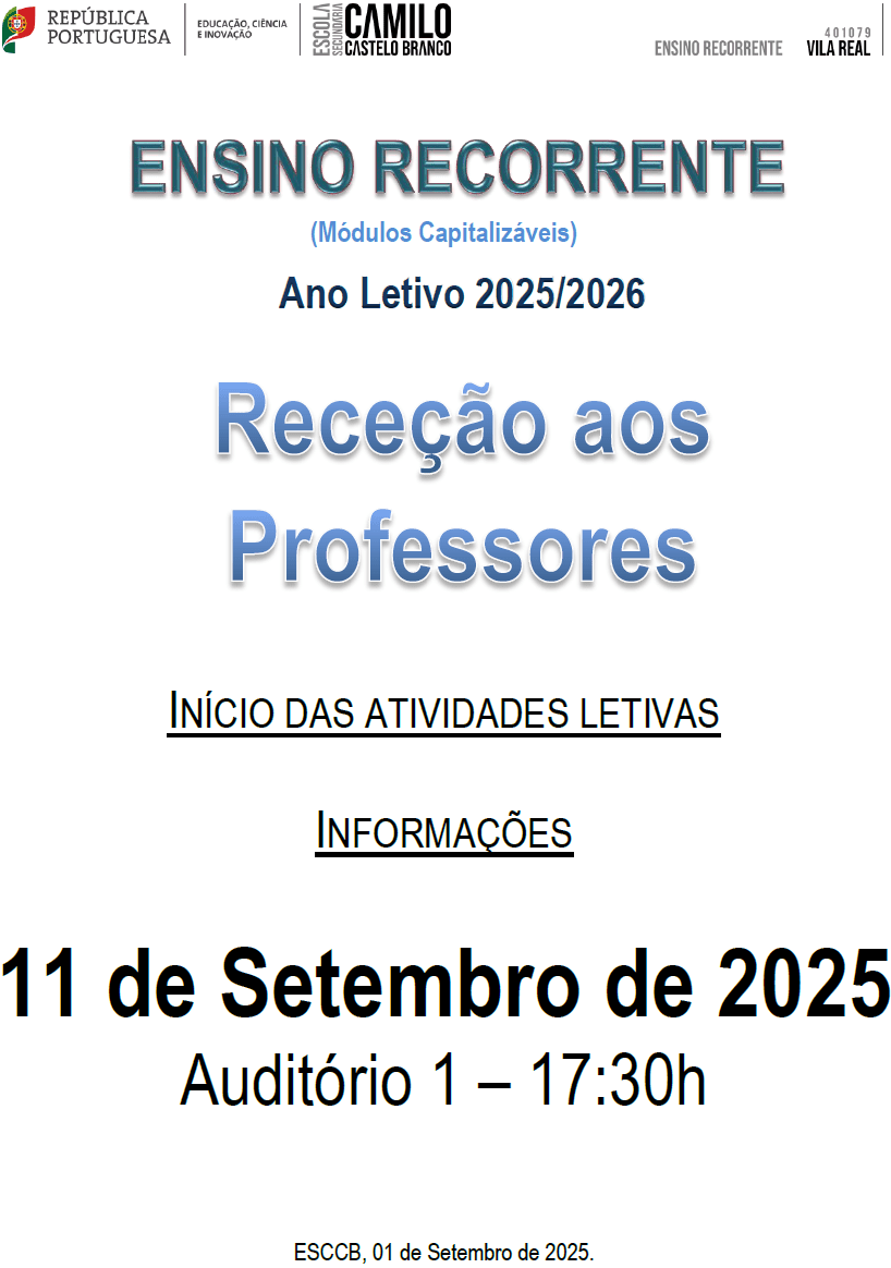 Home Escola Apresentação Órgãos de Administração e Gestão Serviços Associação de Estudantes Obs. Qualidade Inquéritos / Formulários Monitorização / Avaliação Links / Drive Documentos Ano Letivo Calendário Escolar 2025/2026 Oferta Formativa 2025/2026 Manuais 2025/2026 Português Língua de Acolhimento Ensino Recorrente Residência para Estudantes de Vila Real Recursos Biblioteca SPO PNPSE PDPSC PIICIE Escola Digital Ens. Profissional EQAVET Pessoas 2030 Cursos Profissionais Documentação Geral Alunos Diplomados Divulgação Monitorização / Avaliação APEE